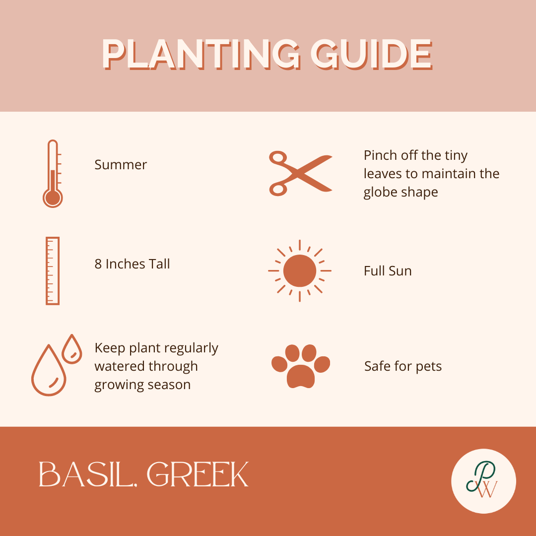 Ocimum basilicum var. minimum - This dwarf variety of basil is popular in Mediterranean cooking. Greek basil has a spicy, lemony taste with an intense basil flavor. Just like your flat-leaf varieties but with a hint of lemon and oregano added. Besides its delicious flavor companion planting with tomatoes, it's full of Vitamins A, K, and C and is rich in magnesium, iron, potassium and calcium! It can also act as an antioxidant, helping the body to get rid of free radicals. Use it in pestos, salad dressings, to flavor water, or general cooking. You can also use it to help ease upset stomachs by mixing in teas, or steep as a facial steam to help alleviate headaches.