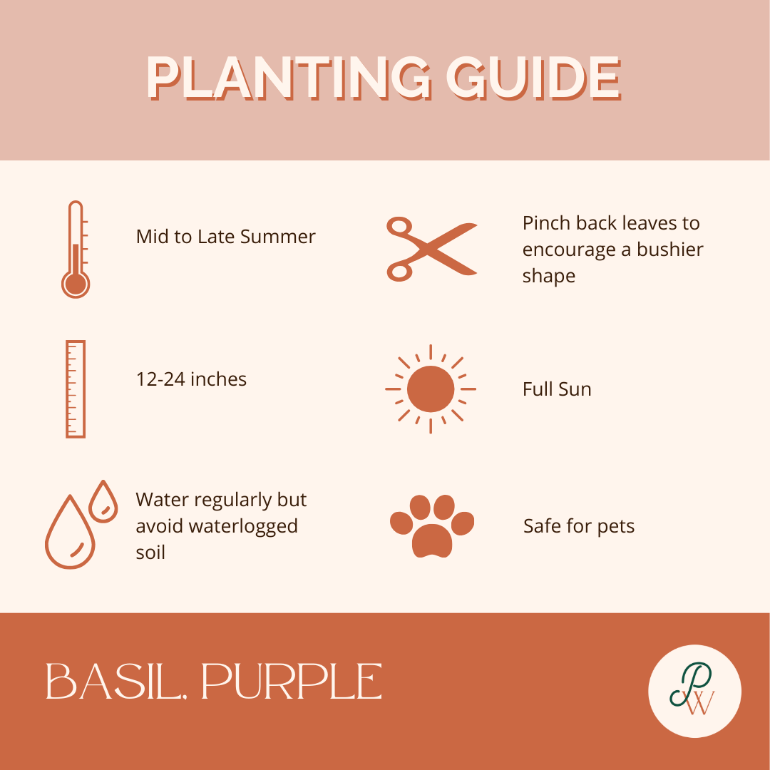 Ocimum basilicum - With its deep purple leaves and bold, slightly spicy flavor, Purple Basil is as striking in the garden as it is on the plate. The vibrant foliage adds a pop of color to herb gardens, while its rich, slightly clove-like taste makes it a great addition to pesto, salads, and infused vinegars. In late summer, it produces delicate pink or lavender flowers that attract bees and other pollinators.