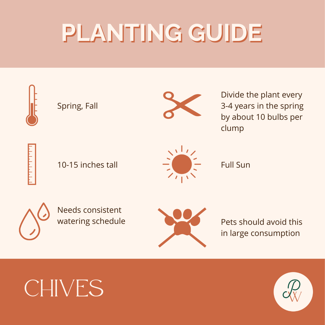 Tip: Chives are excellent companion plants to carrots, celery, lettuce, peas, and tomatoes so plant them between your vegetables or add them to your herb pots.