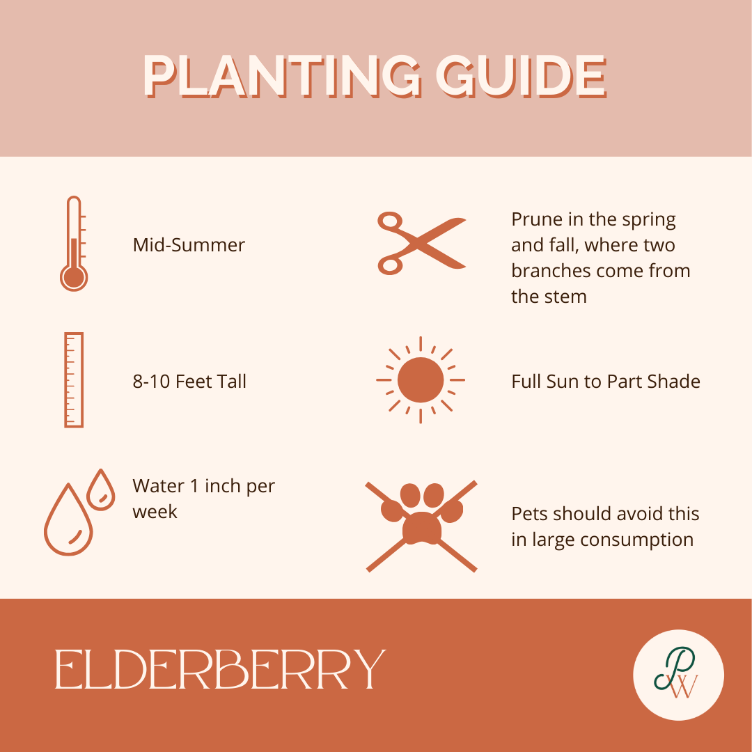 Sambucus - One of our favorite native and medicinal shrubs! Elderberry is truly a powerhouse plant growing as tall as 8-10 feet, boasting clusters of beautiful white flowers in mid-summer turning to deep black fruits. The flowers and fruit are packed full of antioxidants that you can use in a variety of ways.
