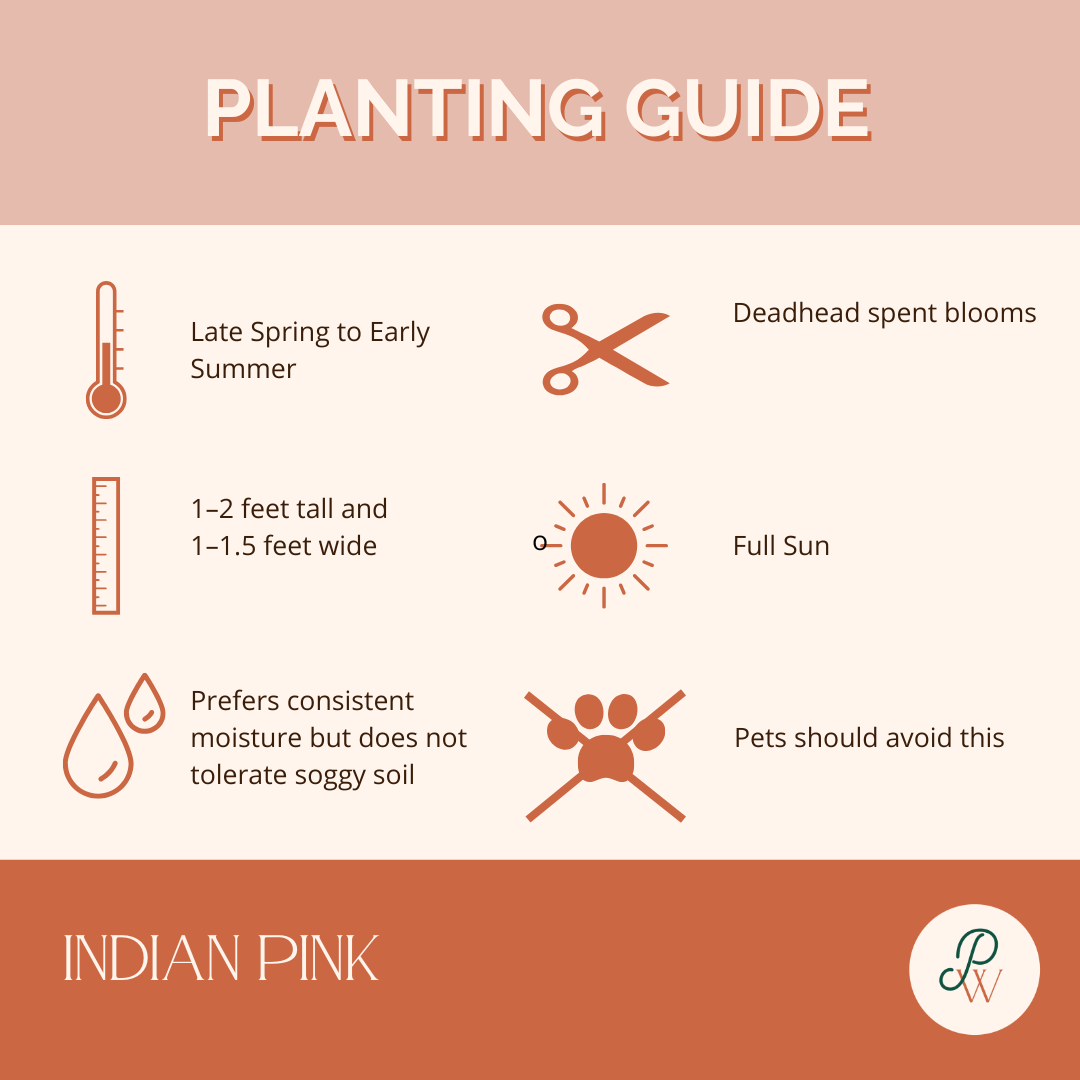 Tip: Indian Pink thrives in rich, partially shaded woodland settings. Plant in groups beneath trees, along shaded borders, or paired with ferns and other native perennials for a vibrant, hummingbird-friendly display.