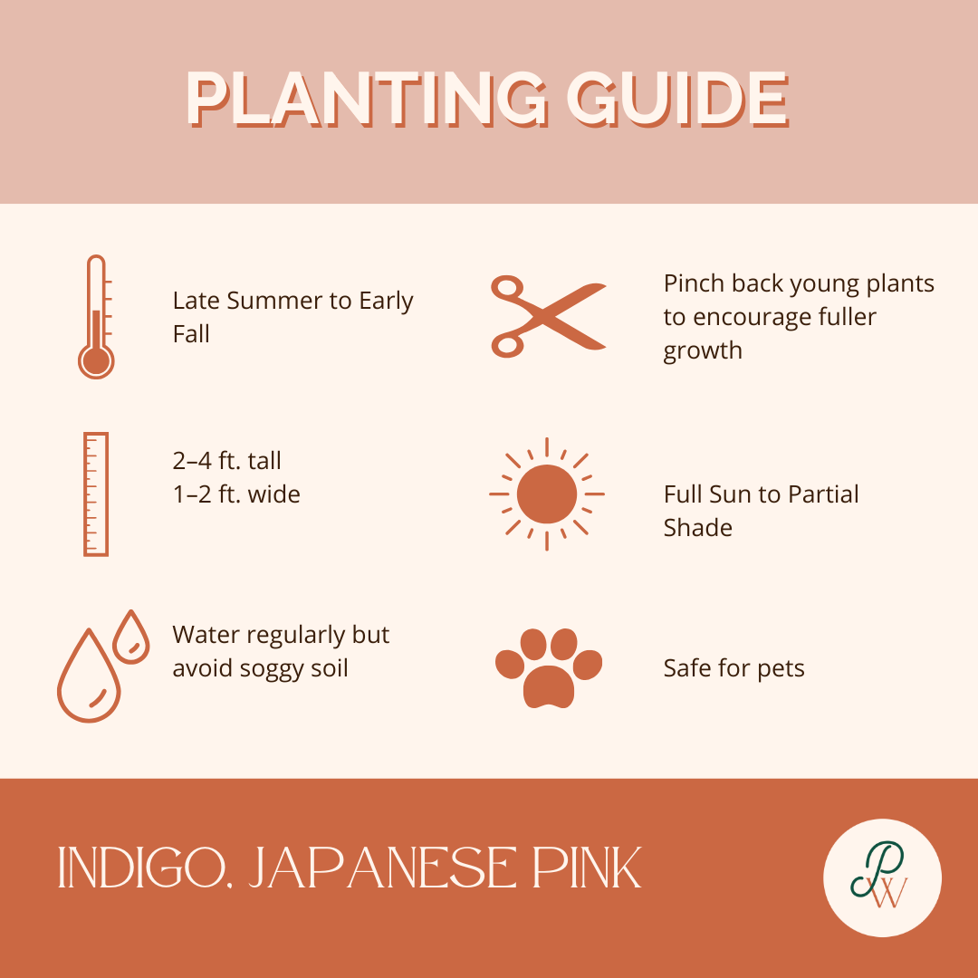 Tip: For the best dye yield, pinch young plants to encourage bushier growth and harvest leaves before heavy flowering. Japanese Indigo grows beautifully in raised beds or large containers and pairs well with other traditional dye plants for a vibrant, functional garden display.
