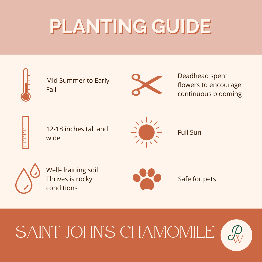 Tip: Besides adding to flower beds, Saint John’s Chamomile thrives in poor, dry soils, making it a great option for xeriscaping and pollinator-friendly gardens.
