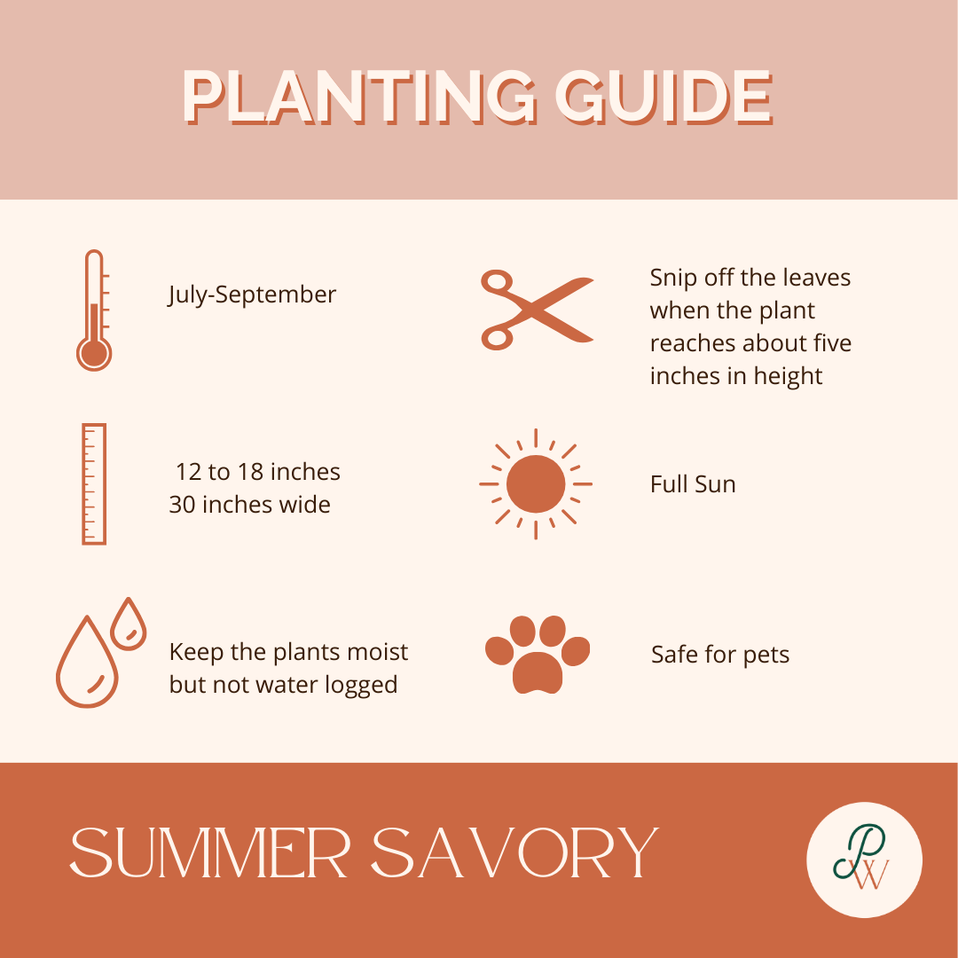 Satureja hortensis - An annual herb related to winter savory which is a perennial, Summer Savory, is less bitter than winter savory but has a strong flavor like oregano. It’s often used when cooking green beans and in the French seasoning mixture, herbes de Provence. Summer Savory attracts beneficial insects to the garden and pollinators love it.This is a low growing plant that is from the mint family.