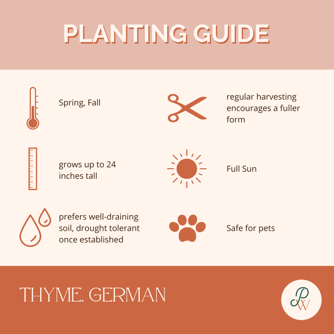 Tip: German Thyme is wonderful between stepping stones or along pathways—its woody stems release a rich, savory fragrance when brushed, creating an inviting sensory garden moment.
