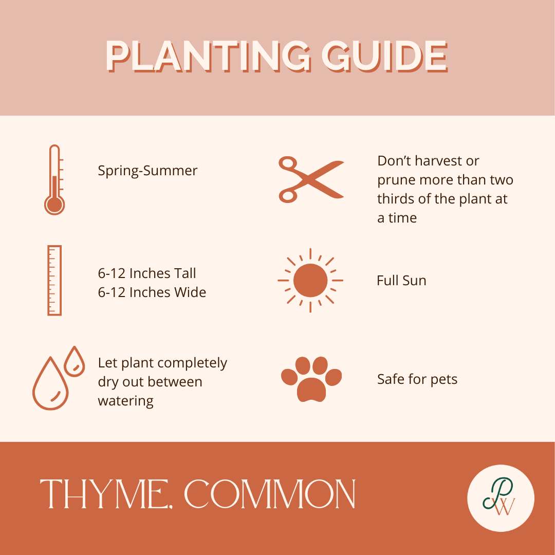 Tip: Thyme makes an excellent fragrant ground cover that pollinators love when blooming. You can use the fresh leaves for cooking to flavor soups, meats, add to oils, flavor fresh vegetables, etc. Or you can hang the herbs upside down to dry and use the dried thyme for seasoning.